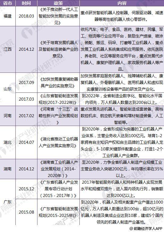截至2018年,有14個地級市出臺機器人產業發展和加大科研投入建立智能型機器人研發機構的相關政策和獎勵機制,包括廣州、佛山、東莞、嘉興、泉州、長沙等。