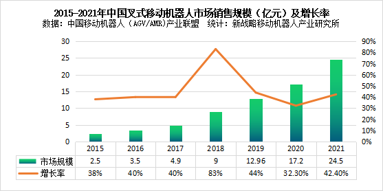 圖表:2015-2021年中國叉式移動機(jī)器人市場銷售規(guī)模(億元)及增長率