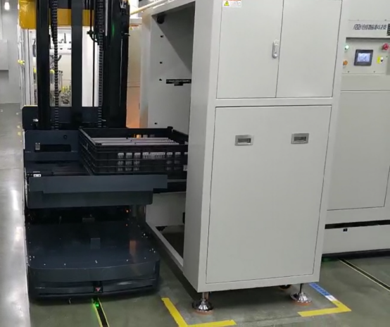 其中,消費類電池靜置庫,因負載輕、出入庫效率相對較低,創智自主研發側向叉車AGV,集柔性物流AGV與堆垛機省空間之優勢,巷道寬度窄(料框寬度+150mm),實現倉庫間以及倉庫到生產設備的跨車間、跨工序的對接和搬運,減少二次周轉和裝載時間。