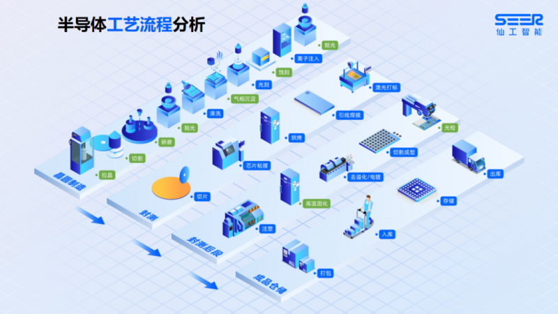 上圖為半導(dǎo)體整個(gè)工藝流程,圖表中清晰標(biāo)注了仙工智能在整個(gè)半導(dǎo)體生產(chǎn)制程中能做的工作,包括清洗、光刻、離子注入、封測整個(gè)環(huán)節(jié)、除高溫固化和光檢以外的封測后段環(huán)節(jié)、成品倉儲(chǔ)整個(gè)環(huán)節(jié),上述環(huán)節(jié)均使用仙工智能自有的解決方案。