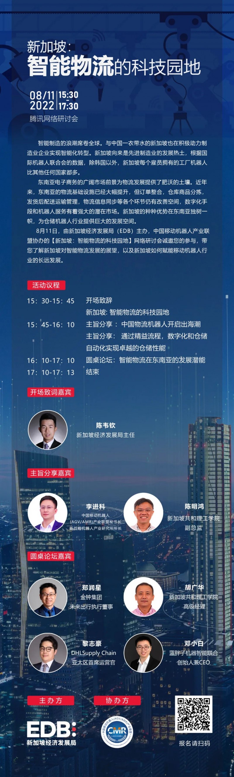 由新加坡經濟發展局 (簡稱經發局EDB) 主辦,中國移動機器人產業聯盟協辦的“新加坡:智能物流的科技園地”網絡研討會將于8月11日舉行。