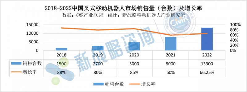 據(jù)CMR產(chǎn)業(yè)聯(lián)盟數(shù)據(jù)、新戰(zhàn)略移動(dòng)機(jī)器人產(chǎn)業(yè)研究所統(tǒng)計(jì),2022年中國叉式移動(dòng)機(jī)器人銷量達(dá)13300臺(tái),同比增長66.25%,市場規(guī)模約為34.68億元,同比增長41.55%。