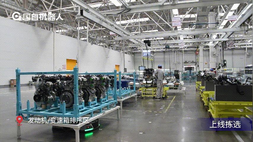 在高位貨架區,質檢合格的零部件由叉式堆垛AGV執行入庫上架任務,搬運至高位貨架區進行存儲,出庫任務由叉式堆垛AGV和潛伏頂升式AGV協同完成。在發動機/變速箱排序區,由潛伏頂升式AGV實現發動機和變速箱料架上線揀選、余料回庫、空托搬運,該解決方案上線后,有效提升倉儲物流效率和汽車生產效率。