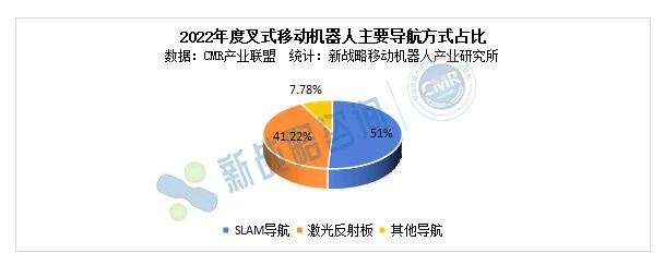 根據(jù)CMR產(chǎn)業(yè)聯(lián)盟數(shù)據(jù),新戰(zhàn)略移動(dòng)機(jī)器人產(chǎn)業(yè)研究所統(tǒng)計(jì),2022年,SLAM導(dǎo)航(激光+視覺)的無(wú)人叉車占比首次超過(guò)了激光有反射板叉車,成為市場(chǎng)應(yīng)用主流,占比為51%,激光反射板無(wú)人叉車增速不如SLAM導(dǎo)航產(chǎn)品,占比下降,為41.22%。