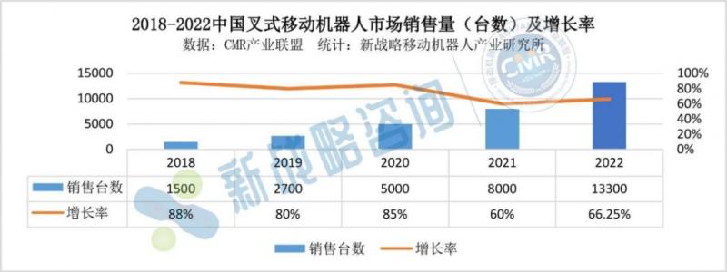 圖表:2018-2022年中國叉式移動機器人市場銷售量(臺數)及增長率