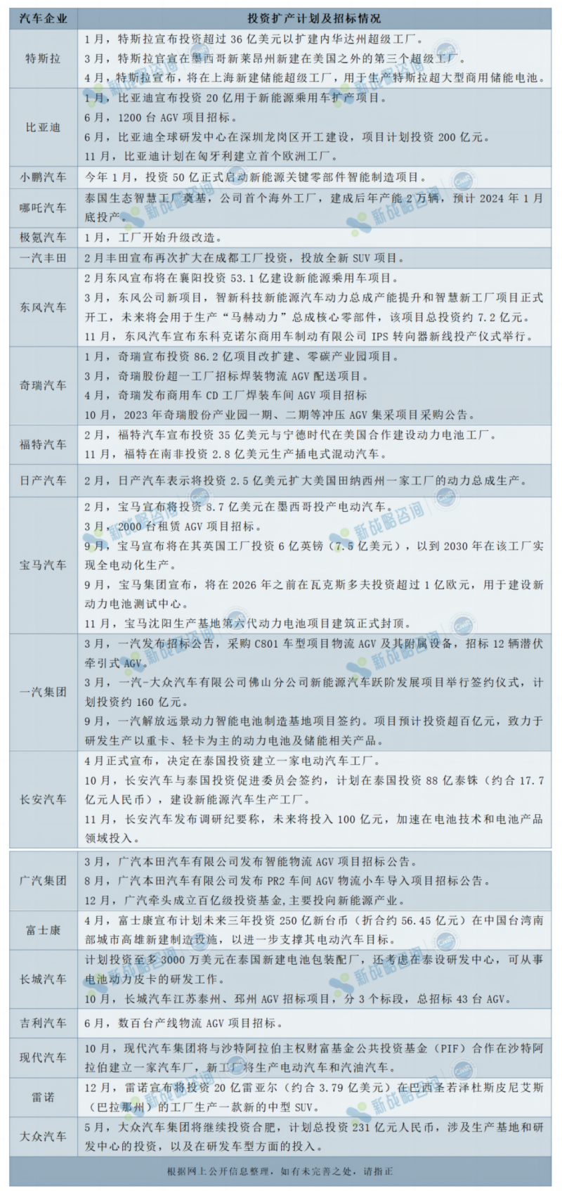 2023年前11月中國汽車銷量(數據來源:中國汽車工業協會)市場回暖,2023年,不少車企都宣布了投資擴產計劃,從下表中可以看出,加碼新能源、擴大全球布局成為行業內的兩大趨勢。國內的新能源車企開始逐步的走向海外,在外投資建廠,而傳統車企為了布局新能源業務,也在積極擴建新能源產線。