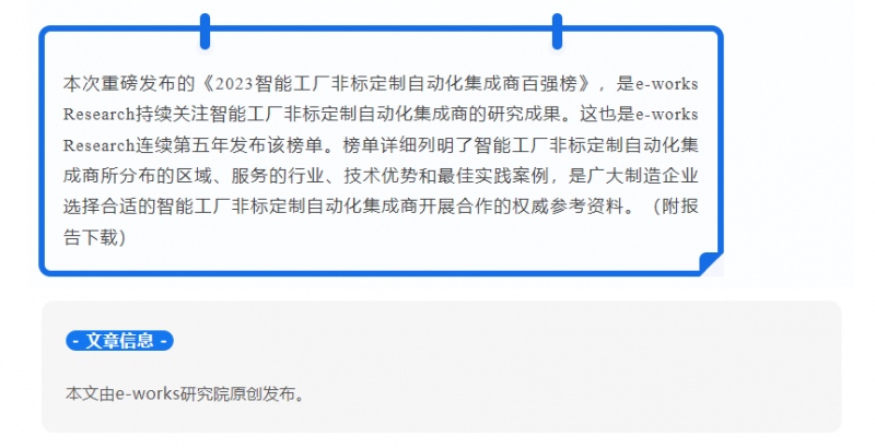 近日,e-works重磅發(fā)布了“2023智能工廠非標定制自動化集成商百強榜”,上海企業(yè)榮占十席,軒田科技榜上有名。此次是軒田科技繼2022年再次上榜,連續(xù)2年躋身中國智能工廠非標自動化集成商百強行列!