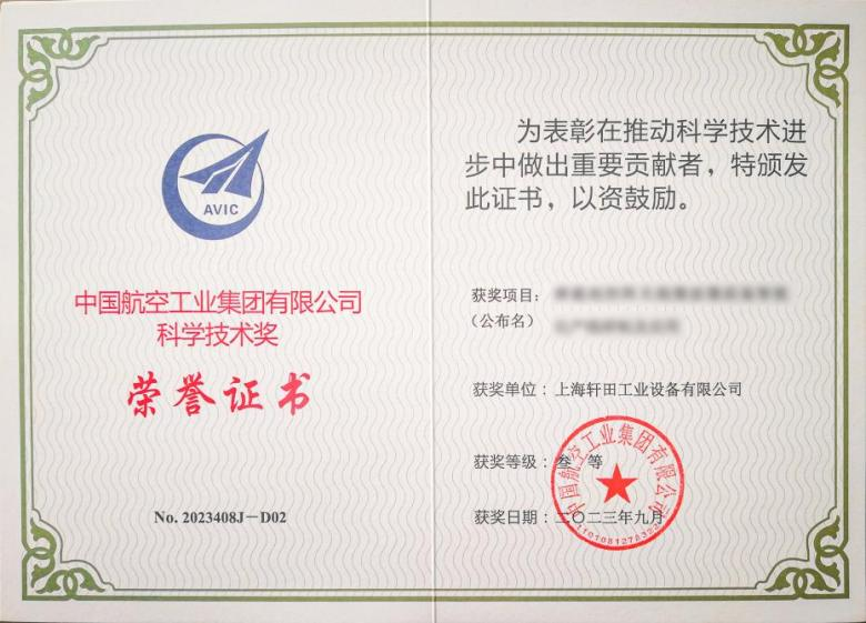 憑借持續(xù)技術創(chuàng)新能力、研發(fā)能力和技術領先能力,軒田科技榮膺中國航空工業(yè)集團有限公司“科學技術獎”。