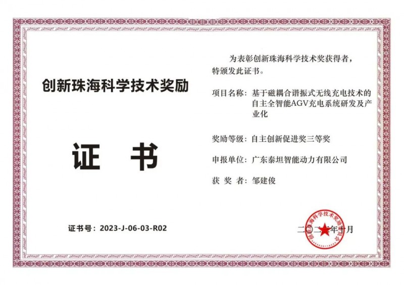 讓我們共同祝賀廣東泰坦智能動力有限公司獲得2023年度創(chuàng)新珠??茖W技術(shù)獎-自主創(chuàng)新促進獎三等獎以及2023年度珠海市科技創(chuàng)新產(chǎn)品獎,并期待我們未來在新能源領(lǐng)域繼續(xù)取得更多突破和成就!