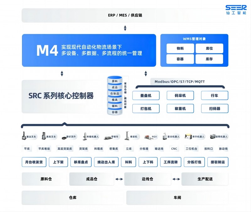 M4 集成 RCS、WCS、WMS 功能于一身,一體化管理解決機器人管理與運單管理問題、各類與機器人配合作業的自動化設備管理問題、入庫出庫等倉儲業務問題,降低系統對接及維護成本,打破多系統間的數據孤島。