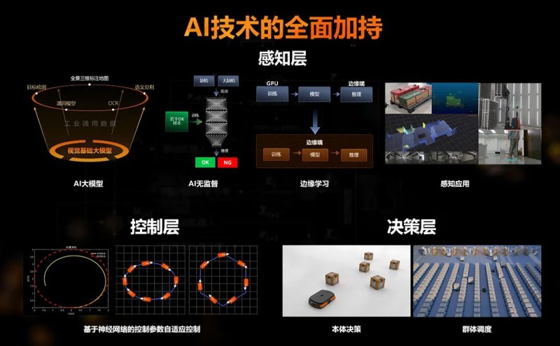 賈永華也提到感知智能的重要性:“正如人的眼睛一樣,未來,我們要給工業制造裝上更多的‘眼睛’,賦予機器感受外部世界的能力,這是機器人理解和執行任務前提。”??禉C器人圍繞機器視覺應用特點,近年來重點研究了AI小樣本學習,無監督學習以及行業大模型等技術難題,推出了10多項AI算法工具,積極推進AI+機器視覺在更多行業的滲透應用;同時??禉C器人將AI算法和經典算法相結合,推出了AI模板匹配、AI讀碼、邊緣學習等特殊算法,部分讀碼相機已能實線上千幀的讀碼和分析。并在環境標注方面,基于大模型的特征,海康機器人構建了全景的三維的標注地圖,通過這樣的方式,??禉C器人有效提升了建圖定位、點云識別、視覺標識檢測等多種環境感知的識別精度,使機器對世界的認識更全面。“在控制層面,我們基于模型的最優控制,運行規劃消除偏差,通過迭代學習,使機器人逐漸適應各種環境,未來其適應能力會越來越強,可以提升控制的自主性和魯棒性。而在當前的決策層面,我們基于AI路徑規劃能力,通過大量規劃路徑數據的學習,使網絡具備專家級的路徑規劃能力。同時利用網絡推理并進行預算,實現半徑毫秒級的快速路程規劃。”賈永華表示,在AI的加持下,極大地增強了智能系統生產能力,這種能力不斷滲透到各個場景、業務和行業,可以有效地將AI技術真正轉變為生產力。