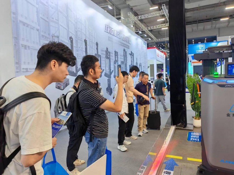 展會現場,JLAMRF-014-S(O)叉式AMR在WMS智慧倉庫管理系統、RCS智能機器人調度管理系統的調度下完成,從接駁區叉取托盤貨物,在1800mm的巷道內,轉運至二層貨架,同時展示了自旋、橫移、自適應叉取托盤時一步叉取到位等多項動作,吸引眾多觀眾駐足觀看、咨詢。