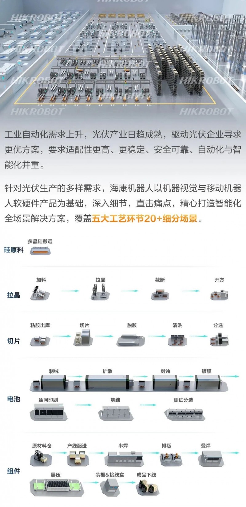 目前海康機(jī)器人已與包括通威、隆基、晶科在內(nèi)的多家光伏頭部企業(yè)在智能制造方面進(jìn)行合作。智能化全場景解決方案在諸多光伏項目中落地應(yīng)用。