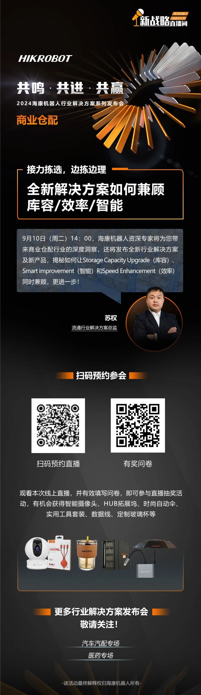 9月10日(周二)14:00,海康機(jī)器人資深專家將帶來商業(yè)倉配行業(yè)的深度洞察與技術(shù)分享,同時(shí)發(fā)布全新行業(yè)解決方案和新產(chǎn)品,揭秘新方案如何做到任務(wù)解耦,接力揀選,同時(shí)突破揀、理貨無法并行的挑戰(zhàn),做到邊揀邊理,讓