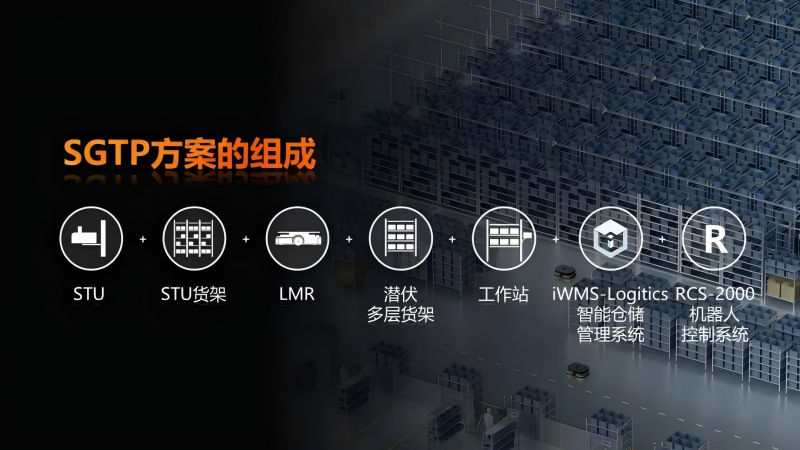 SGTP方案的核心由STU+高位貨架+LMR+潛伏多層貨架+工作站構成。STU操作不同倉位,不同貨架之間的料箱垂直或水平搬運,LMR根據業務需求背負多層貨架至補貨區、緩存區和揀貨工作站,完成補貨、入庫和揀貨出庫。