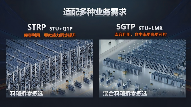兩方案基于高單機效率的STU料箱機器人,通過融合不同產品,同時搭配智能倉儲管理系統iWMS,進一步提升庫容、吞吐效率和減少設備投入,以滿足不同環境和行業特點的多樣化需求。