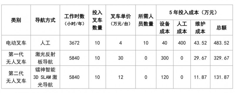 上表假定了某倉(cāng)庫(kù)分別投入10輛電動(dòng)叉車、激光反射板導(dǎo)航叉車、3D SLAM激光導(dǎo)航叉車,并以5年折舊進(jìn)行投資回報(bào)對(duì)比分析。顯然,人工操作的電動(dòng)叉車投入成本最高,經(jīng)濟(jì)回報(bào)效益最低;激光反射板導(dǎo)航叉車雖然單臺(tái)叉車成本高,但在五年折舊期后總投入還是比人工的電動(dòng)叉車要節(jié)省了153.85萬(wàn)元,近32%的成本;而采用鐳神智能3D SLAM激光導(dǎo)航方案的無(wú)人叉車,五年總投入成本僅131.87萬(wàn),比人工電動(dòng)叉車節(jié)省了73%的投入成本、59%的時(shí)間成本,而且五年期間倉(cāng)庫(kù)可以靈活進(jìn)行擴(kuò)建或調(diào)整,全面滿足工業(yè)互聯(lián)網(wǎng)時(shí)代下客戶終端市場(chǎng)隨時(shí)變化的需求,具有更突出的綜合效益!