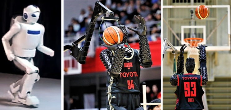 2009年豐田發(fā)布了第二代會跑步的機器人,他的跑速可以達到每小時7公里,當然必須在平坦無障礙的路面跑,還有一款叫CUE4的可以投籃球的機器人。