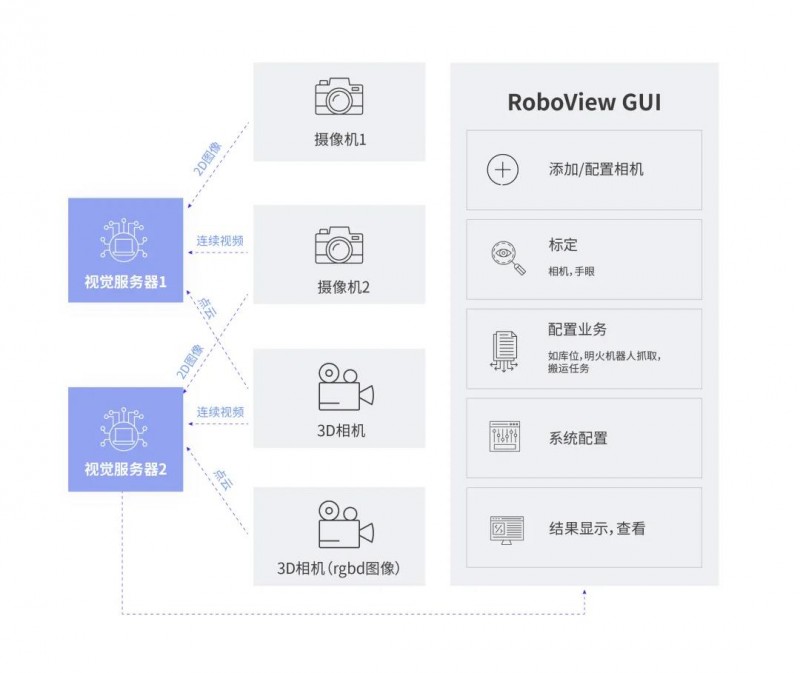 RoboView 視覺 AI 解決方案以先進的機器視覺算法為后臺(RoboView Server),以易于操作和直觀顯示的界面軟件 RoboView GUI 為前端,為客戶提供覆蓋生產(chǎn)、安全、管理等環(huán)節(jié)下的眾多應(yīng)用的視覺 AI 解決方案。