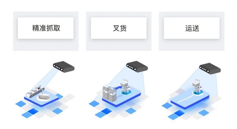 在產(chǎn)線上,RoboView Server 能夠連接多種不同類型的相機,如使用激光相機拍攝視野中任意位置的貨物,對獲取到的 3D 點云,運用點云算法識別、定位算法精確(最高可精度達到0.1mm)的計算出產(chǎn)品的位姿和外形尺寸信息,并發(fā)送給機械臂或 AGV,精準抓取、 裝包或叉貨、運送的任務(wù),或是智能引導(dǎo)涂膠等