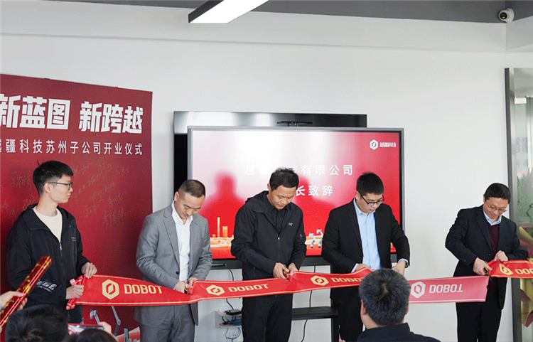 開業典禮上,深圳市越疆科技有限公司董事長兼CEO劉培超、越疆智能機器人(蘇州)有限公司總經理劉主福、深圳市越疆科技有限公司工業事業部副總經理劉曉明、深圳市越疆科技有限公司工業事業部商務運營總監李劉偉共同為越疆科技蘇州子公司揭牌剪彩。