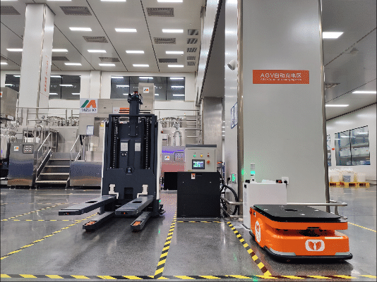 同時(shí),由Gulf-1400-CDD無人叉車機(jī)器人負(fù)責(zé)原材料從原料倉(cāng)到乳化車間的搬運(yùn)、空桶的產(chǎn)線返回、半成品從產(chǎn)線到車間的中轉(zhuǎn)、包材的產(chǎn)線搬運(yùn),搭配FMS調(diào)度管理系統(tǒng),實(shí)現(xiàn)最優(yōu)任務(wù)分配方案,讓倉(cāng)儲(chǔ)物流整體效能最大化。