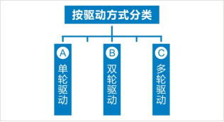 按照驅(qū)動(dòng)方式分,可分為單輪驅(qū)動(dòng)、雙輪驅(qū)動(dòng)、多輪驅(qū)動(dòng)。