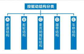 按驅(qū)動(dòng)結(jié)構(gòu)分,可分為差速結(jié)構(gòu)、舵輪結(jié)構(gòu)、麥克納姆輪型結(jié)構(gòu)、履帶結(jié)構(gòu)、車橋結(jié)構(gòu)等。
