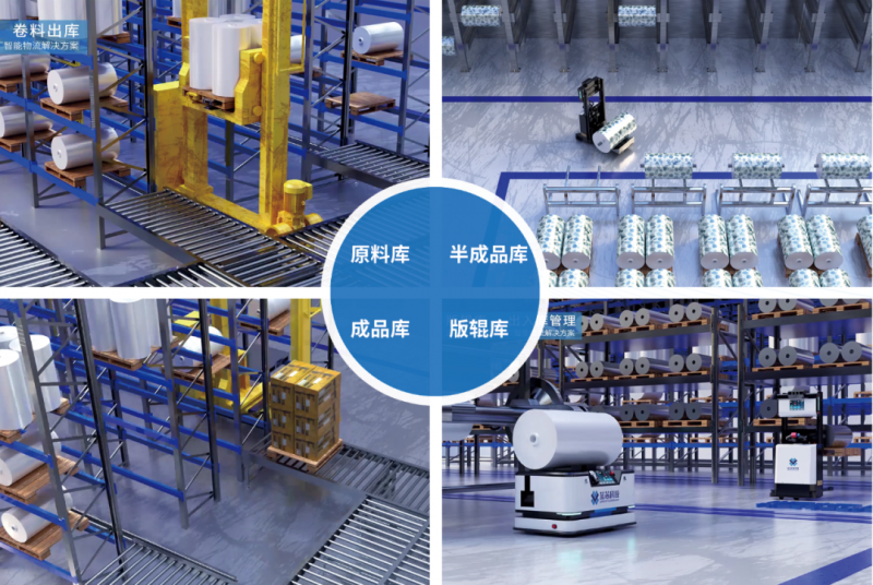 針對以上痛點,藍芯科技以智能拆包裝置、打橫裝置、上下料機器人、無人叉車、搬運機器人、分切下料打包自動線為主體,結(jié)合智能倉儲設備、信息化管理系統(tǒng),實現(xiàn)包裝企業(yè)來料自動拆包、物料自主搬運、卷料自動上/下料、庫位自動識別、成品/半成品/原料自動出入庫作業(yè)。